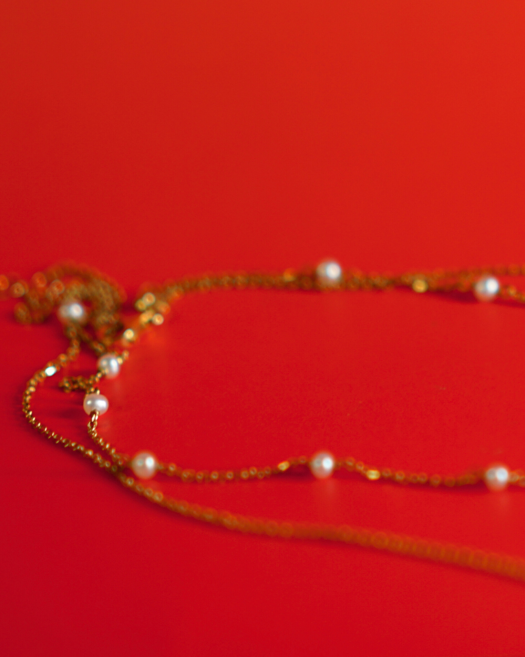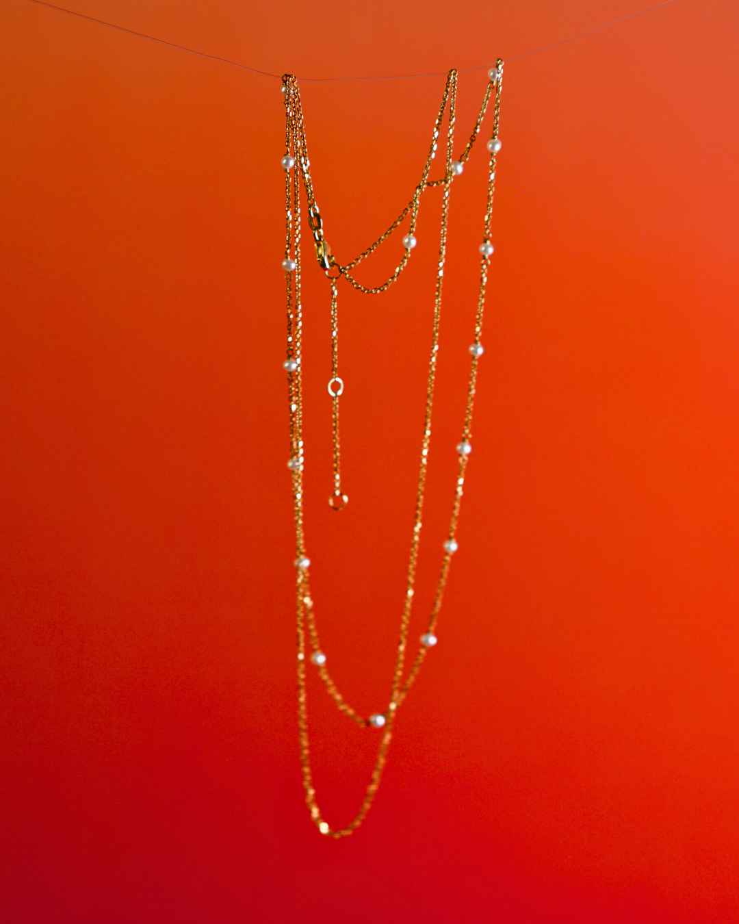 double-chained pearl station necklace. 14K solid gold, vintage, 18 inches long, staggared, has an adjuster.