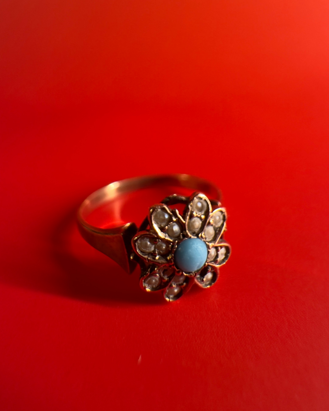 Vintage 10k gold, Turquoise Colored Glass, Seed Pearls, Flower Ring, Sz.5.5, British Origin