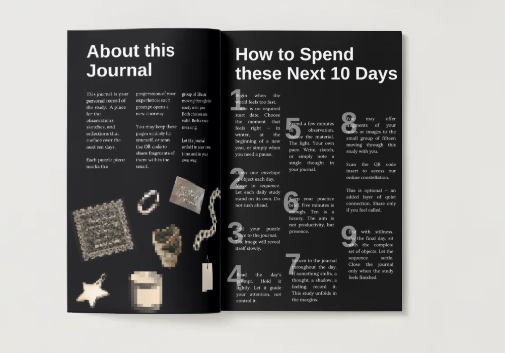 Over ten days, you will open a sequence of sculptural and symbolic objects composed of silver, gold, clay, and archival fragments. Each object arrives with a daily prompt and a puzzle piece placed inside your field journal. The hand-molded tray becomes the landscape for your study, shifting gradually as each object enters the space.